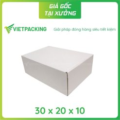 Hộp carton nắp gài 30x20x10 có thiết kết dễ gấp gọn và tháo dỡ tiết kiệm diện tích lưu trữ, trọng lượng nhẹ mà chắc chắn nên dễ dàng trong khâu đóng gói và vận chuyển sản phẩm bên trong an toàn.